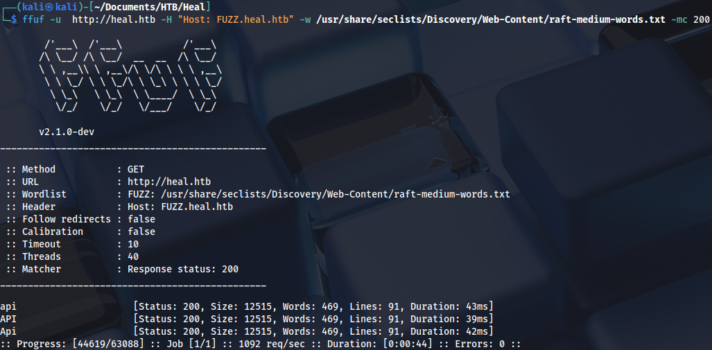 ffuf -u http://heal.htb -H "Host: FUZZ.heal.htb" -w /usr/share/seclists/Discovery/Web-Content/raft-medium-words.txt -mc 200