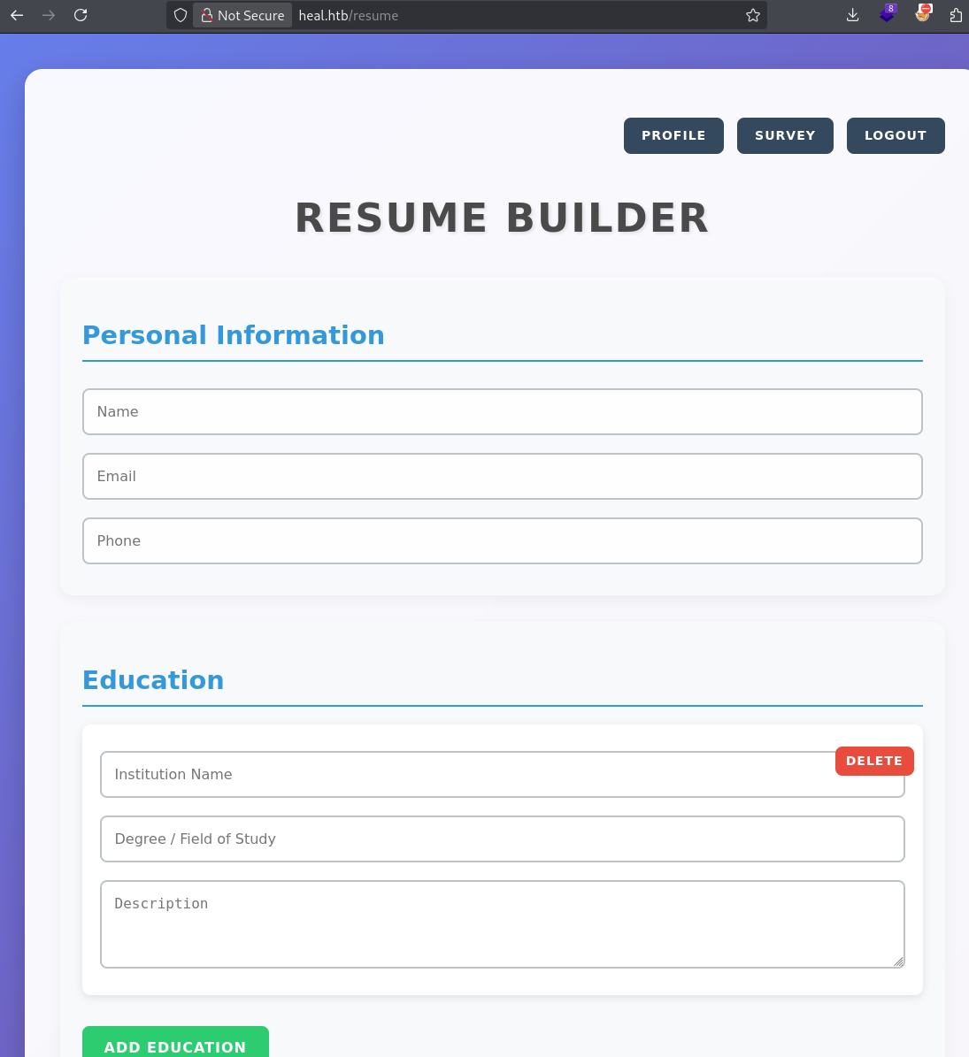 The main site hosts resume builder web application, which leads to local file inclusion vulnerability. This vulnerability can be used to read Ruby configuration file on API subdomain, which gives us SQLite3 database location. Database enumeration reveals bcrpyt hash, which can be cracked and used for LimeSurvey login. We will abuse plugin installation for remote code execution on LimeSurvey to get initial access. There is a passsword in PostgreSQL configuration file, which can be used for SSH as another user. To get root, we will use an RCE exploit for HashiCorp Consul.