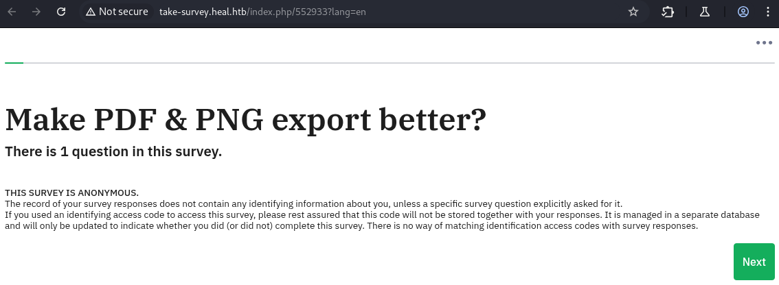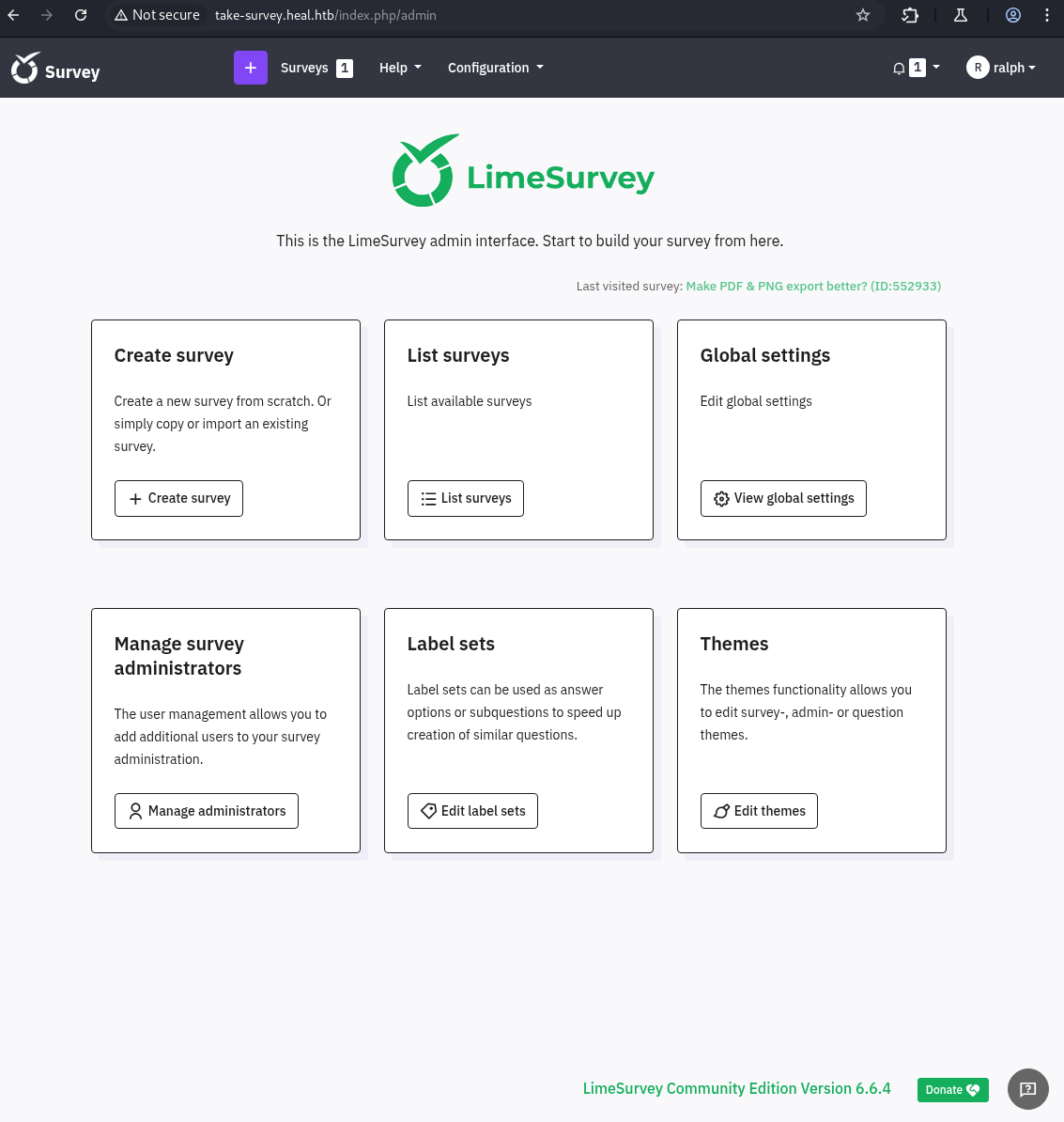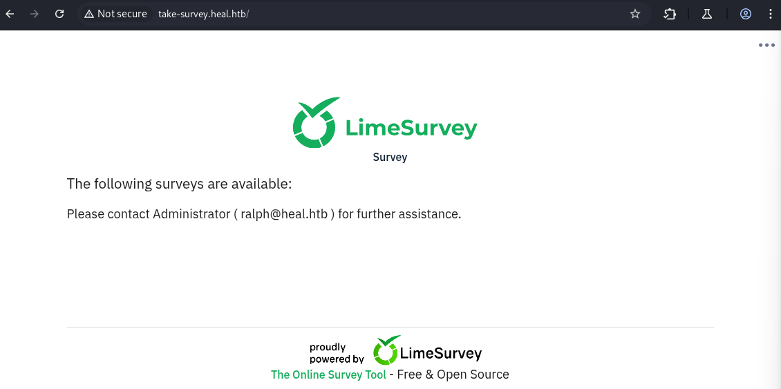 Public exploit exists, but we don’t know the software version yet: https://www.exploit-db.com/exploits/50573 https://github.com/Y1LD1R1M-1337/Limesurvey-RCE