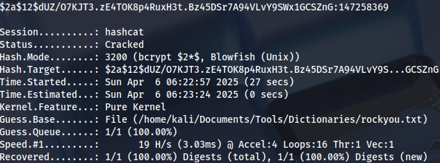 hashcat -m 3200 hash.txt /home/kali/Documents/Tools/Dictionaries/rockyou.txt