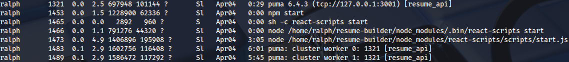 Checking processes, we can see that Ralph runs NodeJS service on port 3000: