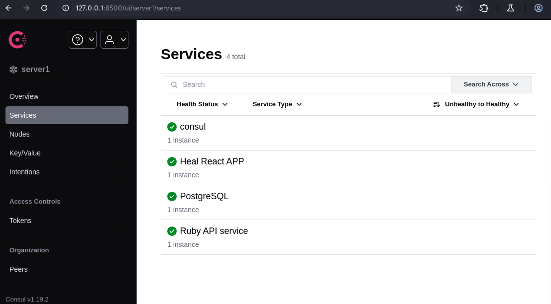 ssh -L 5432:127.0.0.1:5432 -L 3000:127.0.0.1:3000 -L 8300:127.0.0.1:8300 -L 8300:127.0.0.1:8300 -L 8503:127.0.0.1:8503 -L 8500:127.0.0.1:8500 ron@heal.htbOpening the URL on local machine, we can see Hashicorp Consul v1.19.2:
