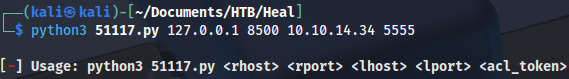python3 51117.py 127.0.0.1 8500 10.10.14.34 5555