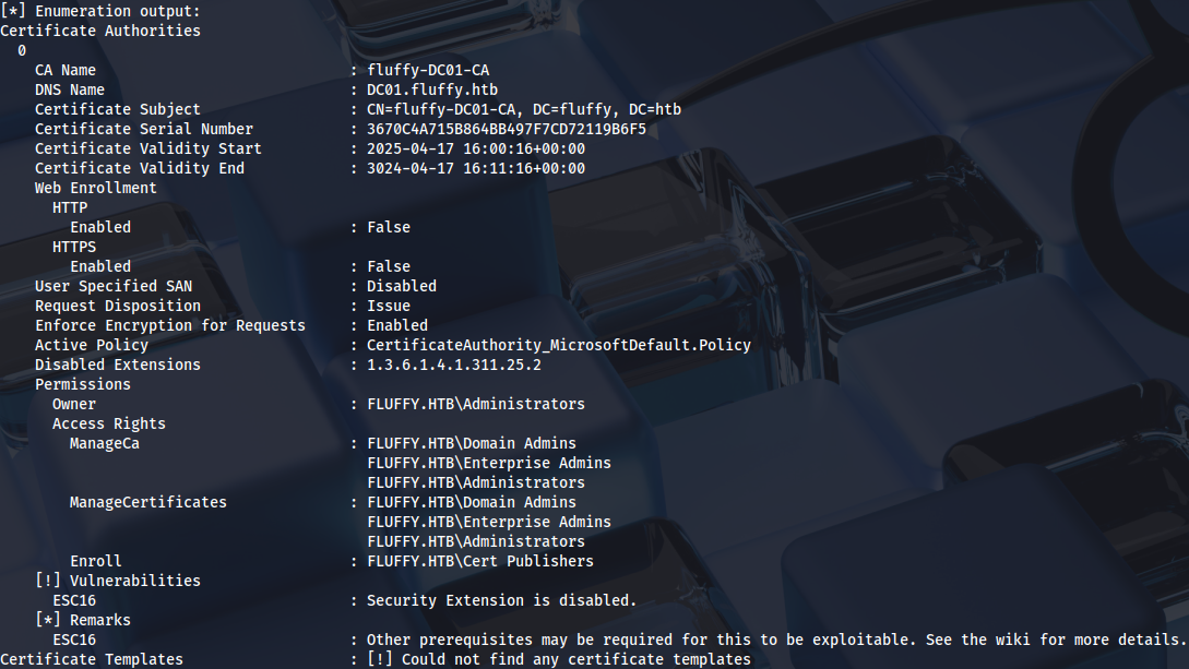 certipy-ad find -u ca_svc -hashes ca0f4f9e9eb8a092addf53bb03fc98c8 -dc-ip 10.129.80.219 -stdoutNeće direktno pisati ESC16, nego treba čitati konfiguraciju: