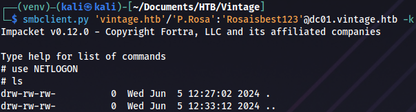 smbclient.py 'vintage.htb'/'P.Rosa':'Rosaisbest123'@dc01.vintage.htb -k
