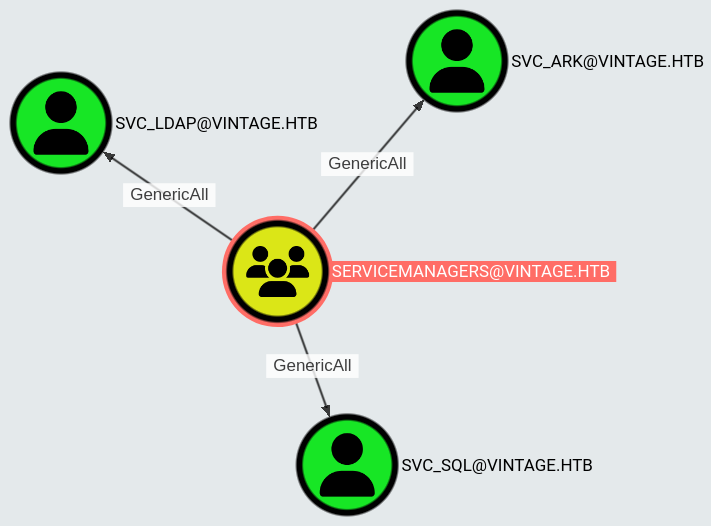 Members of this group have GenericAll privileges on three service accounts: