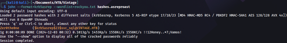 john --format=krb5asrep --wordlist=rockyou.txt hashes.asreproast