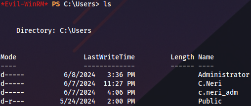 export KRB5CCNAME=C.Neri.ccacheWhen Evil-WinRM doesn’t work we can use this script to configure Kerberos realm: https://gist.github.com/zhsh9/f1ba951ec1eb3de401707bbbec407b98