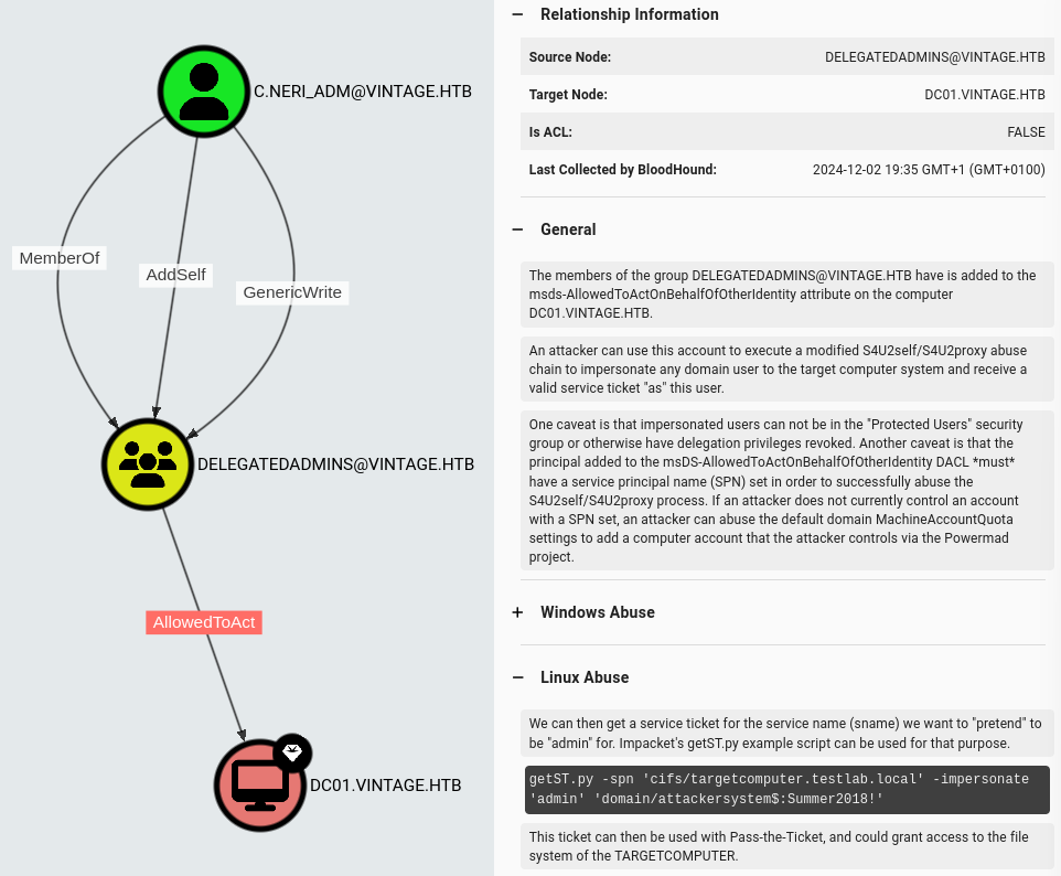 export KRB5CCNAME=C.Neri_adm.ccacheThis user has AllowedToAct privilege on Domain Controller, which leads to Resource-based constrained delegation attack: